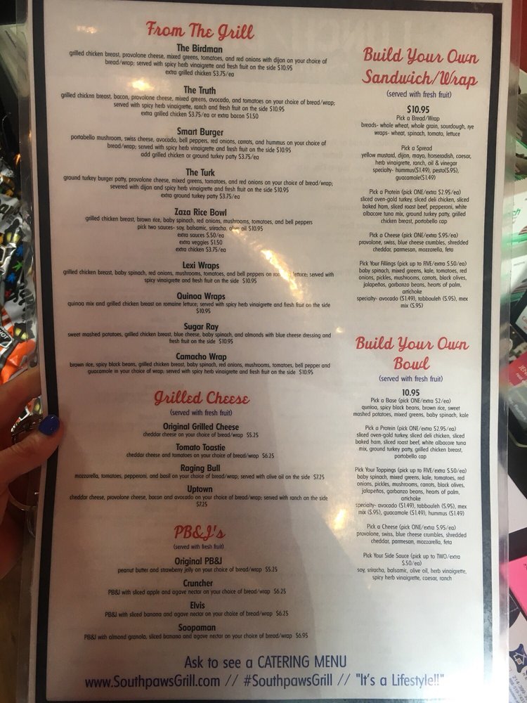 Southpaws Grill, located in Dallas, TX, offers a variety of breakfast bites, build-your-own sandwiches, wraps, salads, and beverages. With options like the Robyn, Major Malcolm, and Fruit-Wich, there is something for everyone's taste. Customers rave about the fresh and delicious food, as well as the quick service. The cozy atmosphere and attentive staff make dining at Southpaws Grill a delightful experience. The menu includes healthy options like the power salad and smoothies, catering to those watching their macros or looking for a lighter meal. Whether you're grabbing lunch on the go or sitting down for a meal, Southpaws Grill is sure to impress with its flavorful dishes and welcoming ambiance.